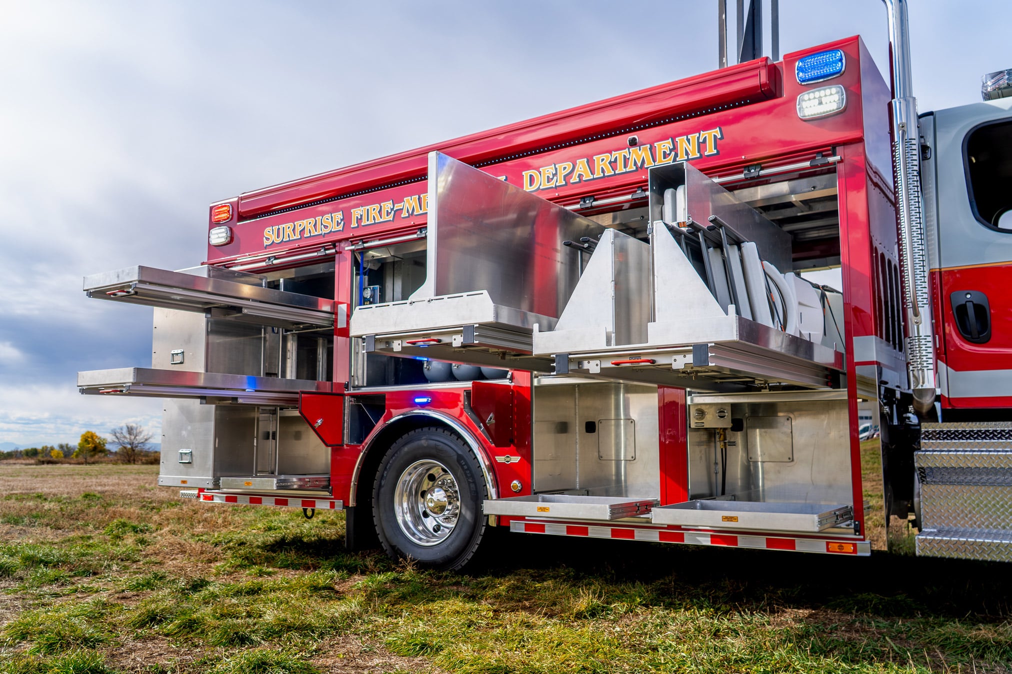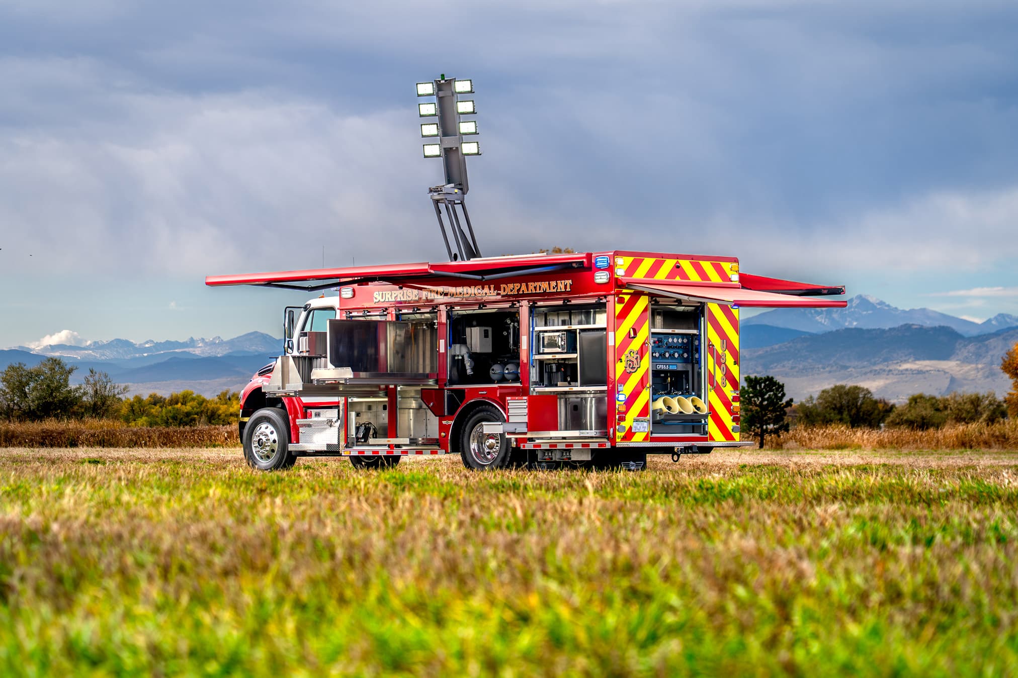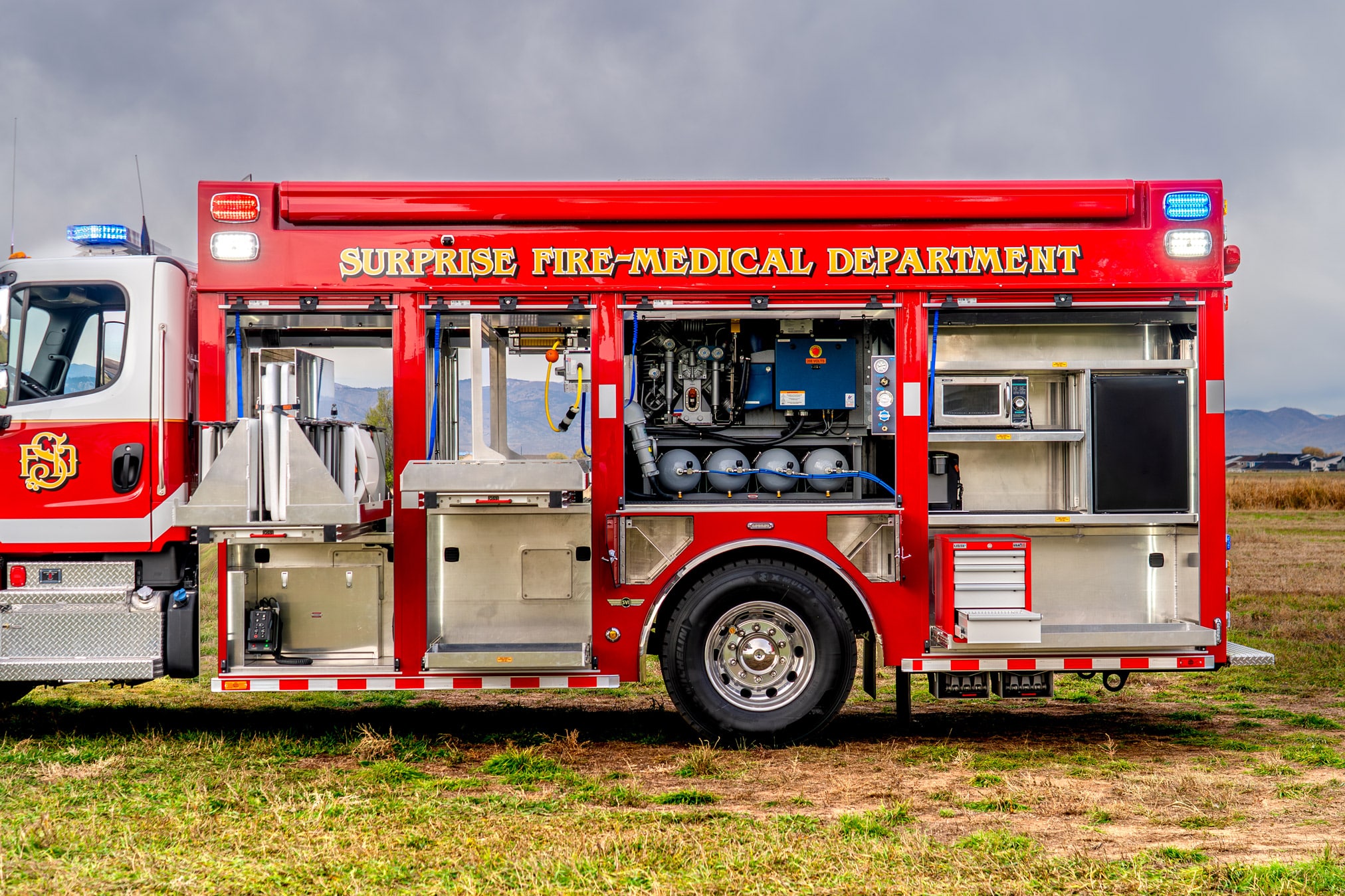 When spec’ing its new Aur/Light unit, the Surprise Fire-Medical Department (AZ) chose a 18′ aluminum SVI body mounted on a Freightliner M2 106 Plus chassis, which houses a Cummins L9 360 HP engine. This Air/Light support unit comes equipped with a Marathon 80-KW generator, Bauer CFS 5.5 3M SCBA refilling station, Aeromist exterior misting system and much more.