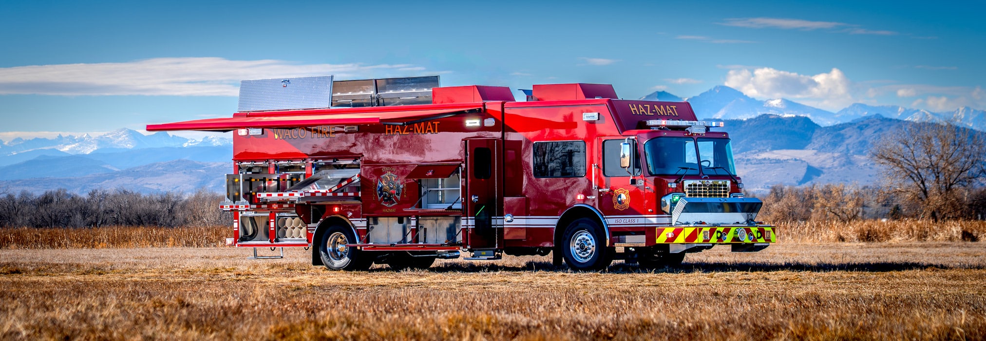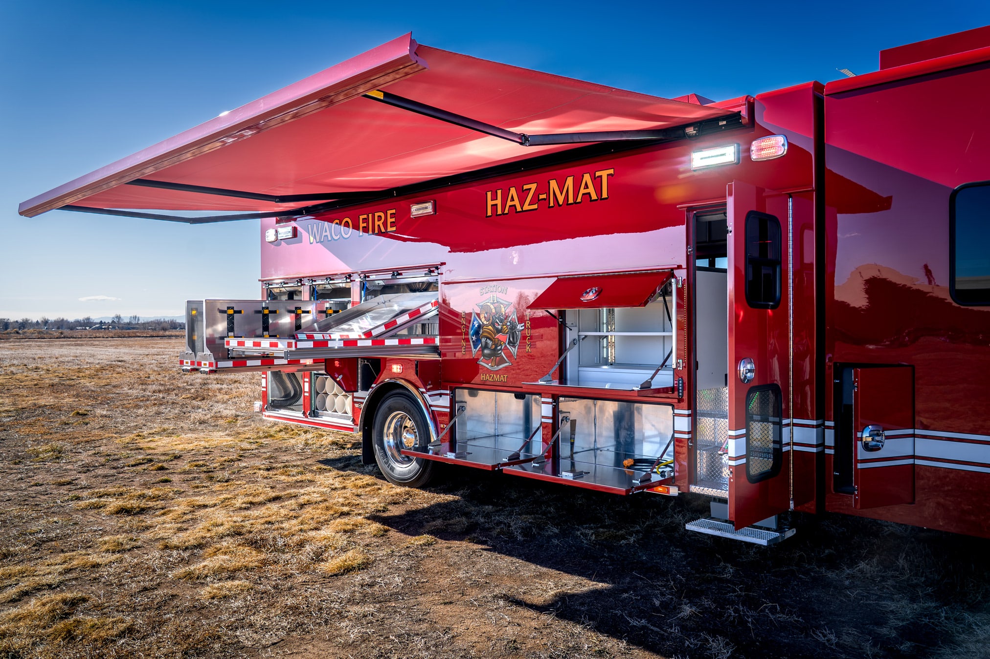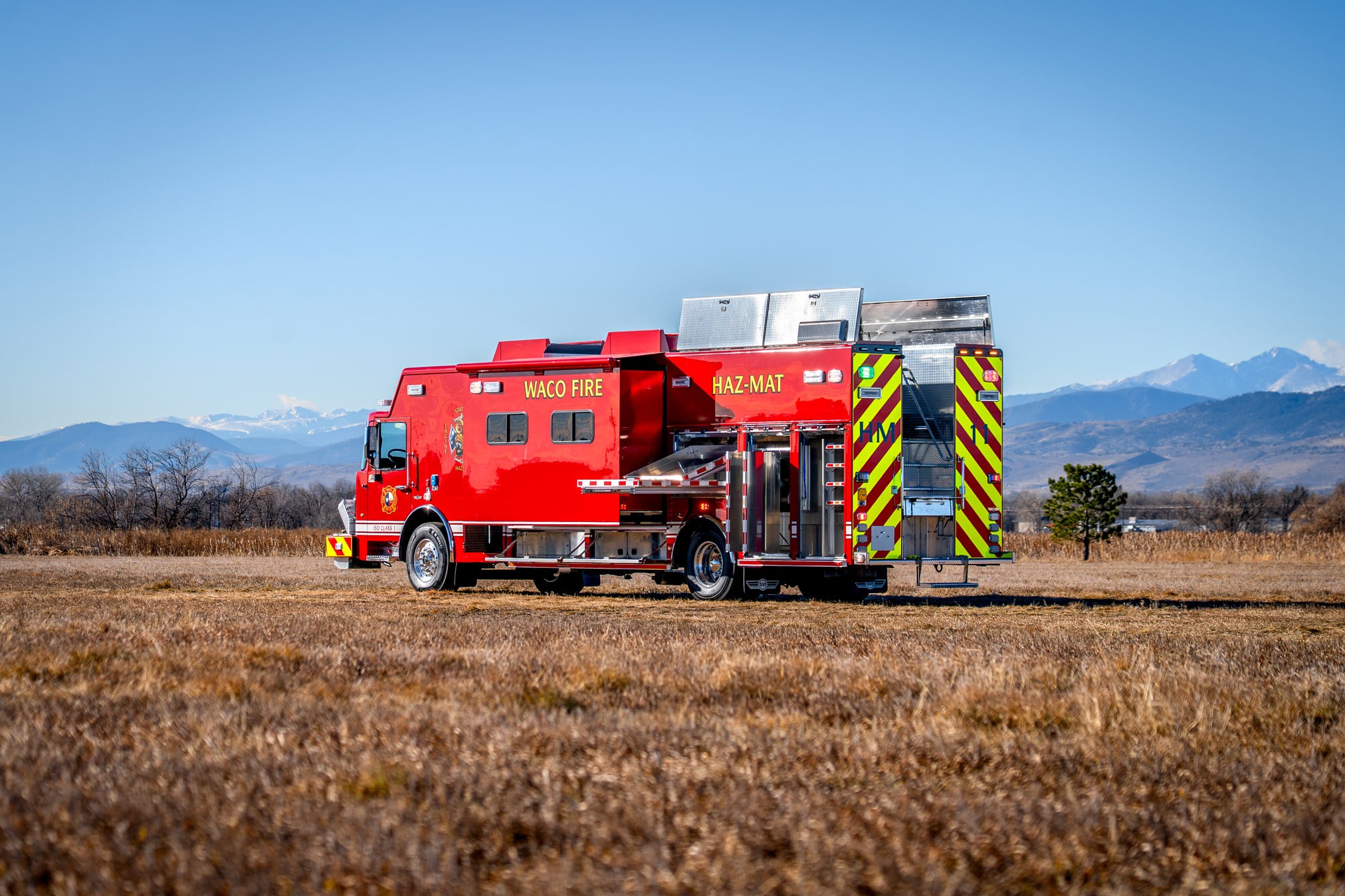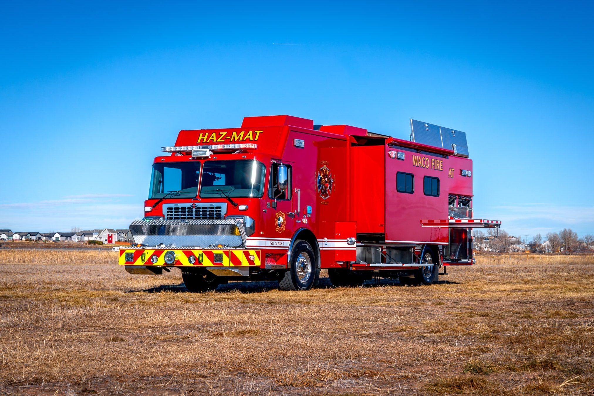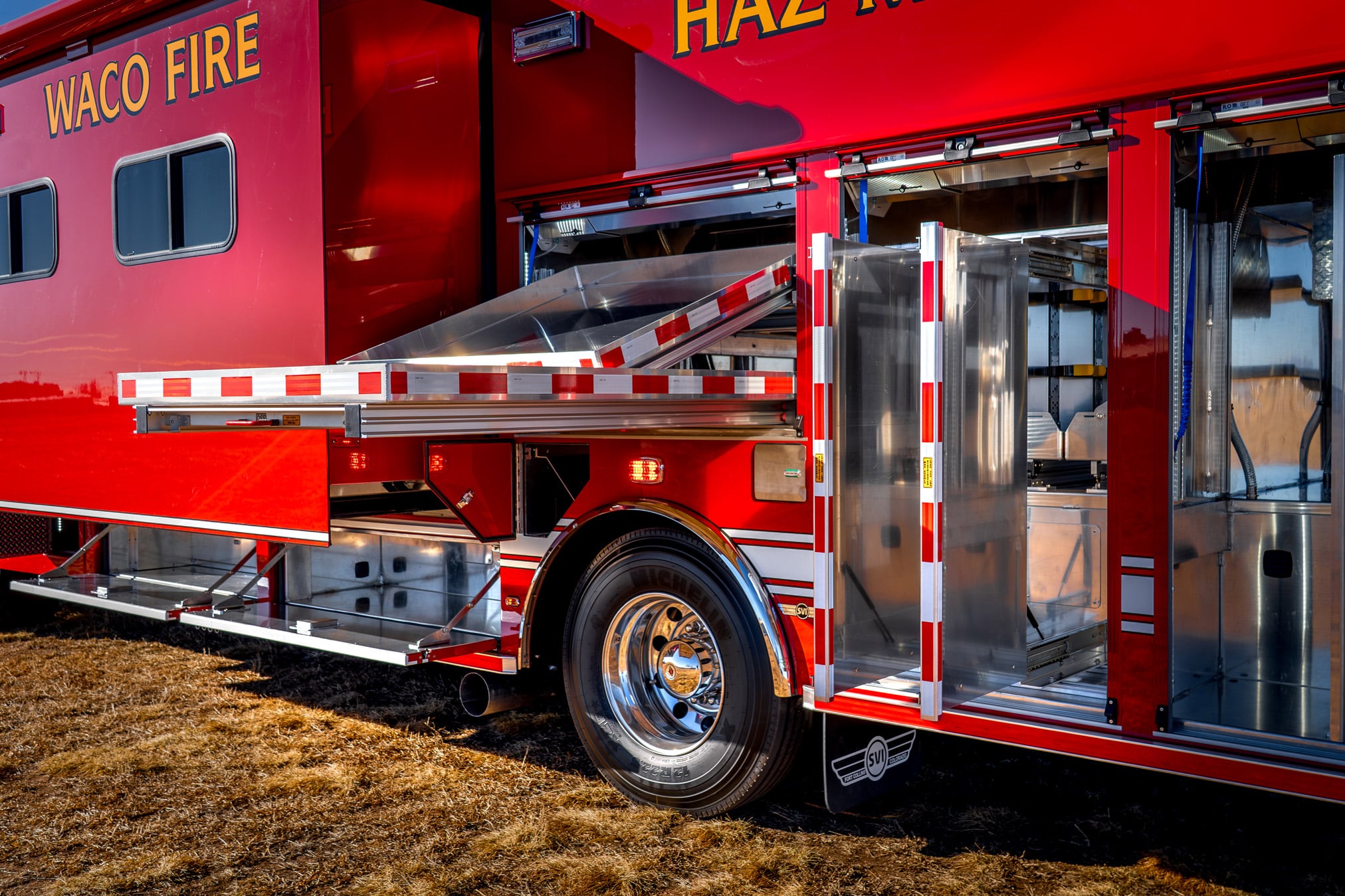 When spec’ing its new Hazmat, the Waco Fire Department, chose a 24′ aluminum SVI body mounted on a Spartan Gladiator ELFD chassis w/ 24″ RR, which houses a Cummins X12 525 HP Engine. This rock-solid hazmat comes with a 32″ in-body slideout, oil absorbent dry storage hopper, and Harrison HydraGen 15-KW generator.